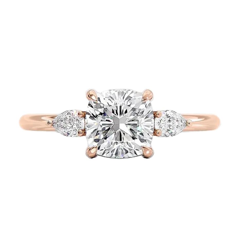 Nombre del Producto:Anillo de compromiso de oro rosa con tres diamantes de talla cojín de 1,5 quilates