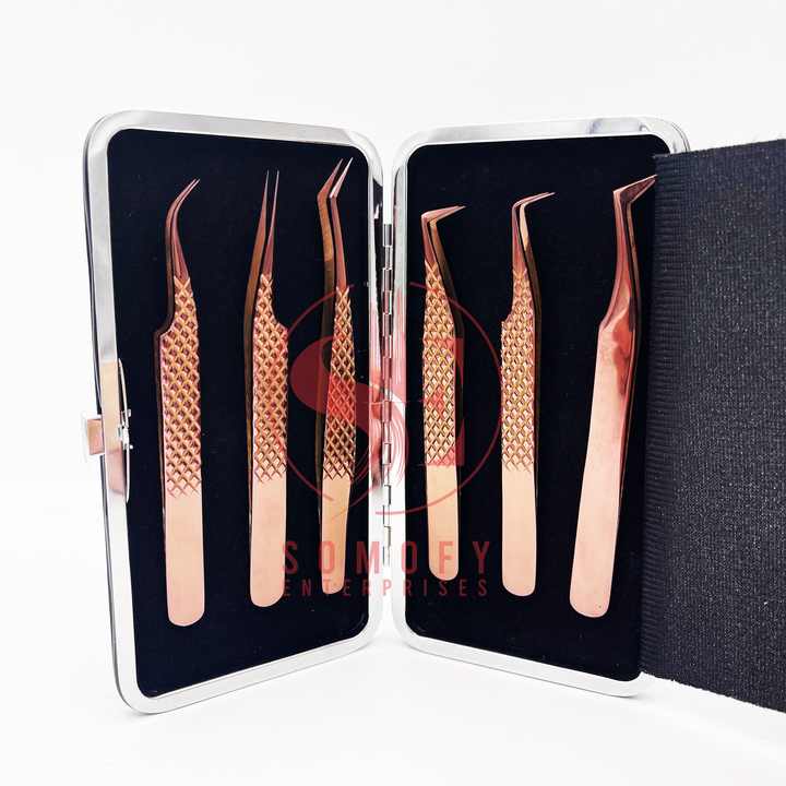 Pinzas para Extensión de Pestañas de Fibra de Oro Rosa de Marca Privada Somofy Enterprises, Forma de L de 45/90 Grados, Acero Inoxidable, Longitud de 10 mm