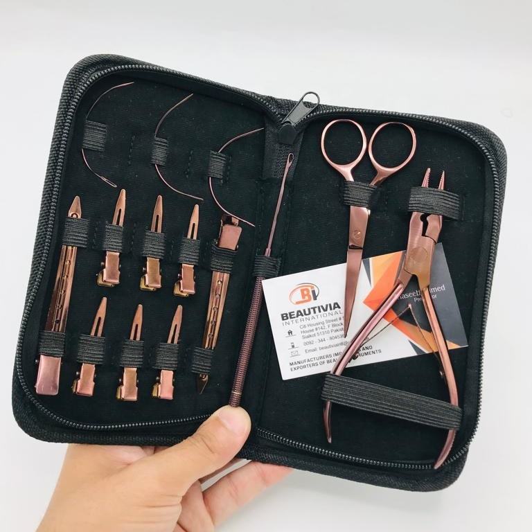 Juego de herramientas de alicates de extensión de cabello profesional de acero inoxidable chapado en oro rosa con gancho de pinzas de sección de cabello y tijera
