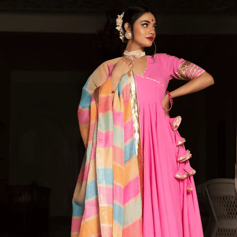 Conjunto de Angrakha Kurta y Dupatta de Algodón Rosa | Encaje Kota Doria | Largo Midi | Ropa Étnica Elegante para Bodas y Fiestas de Diwali