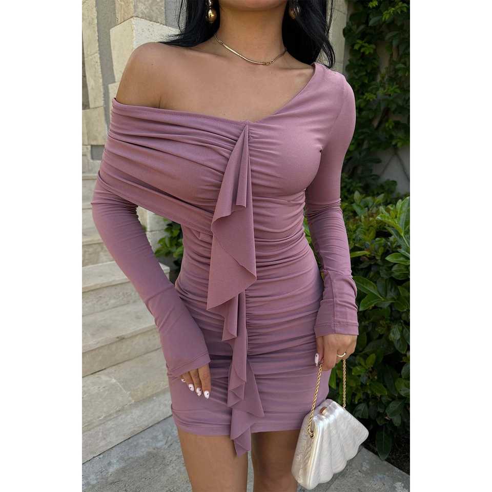 Minivestido Rosa Translúcido con Volantes, Elegante y Sexy, con Cierre Personalizado, Detalles de Diamantes y Corte Drapeado hasta la Rodilla, Ideal para la Oficina