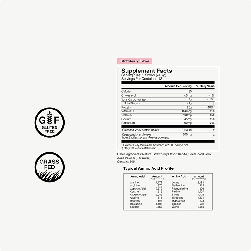 Ingrediente principal:Proteína, Vitamina D, Calcio Sodio Potasio, Aislado de proteína de suero de leche alimentado con pasto