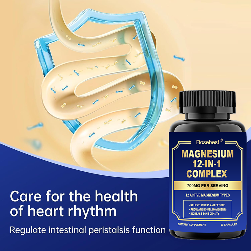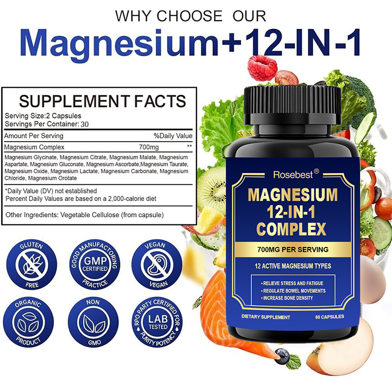 Cápsulas de Complejo de Magnesio Vegano 700mg 12 en 1 de Marca Privada Rosebest con Fórmula y Empaque Personalizables, Certificado GMP