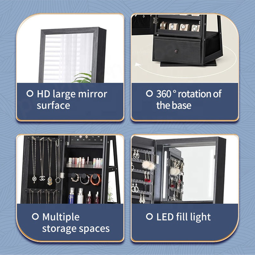 Espejo giratorio de almacenamiento con espejo, soporte de suelo de madera, con gabinete de joyería, muebles multifuncionales para sala de estar