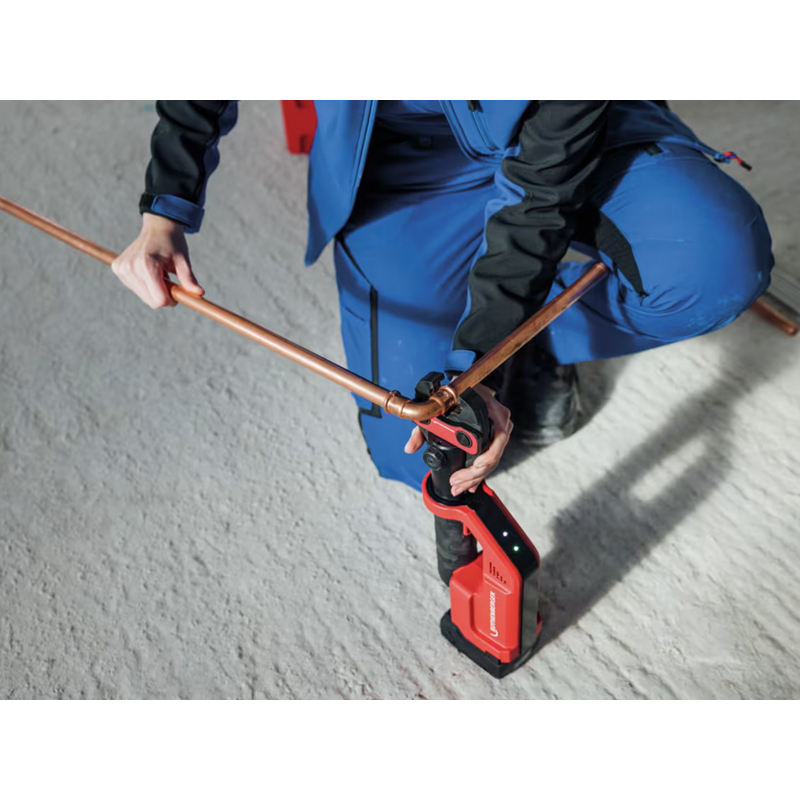 Herramienta de prensa Rothenberger Romax Compact III AMP en conjunto con batería, cargador y 3 mordazas SV