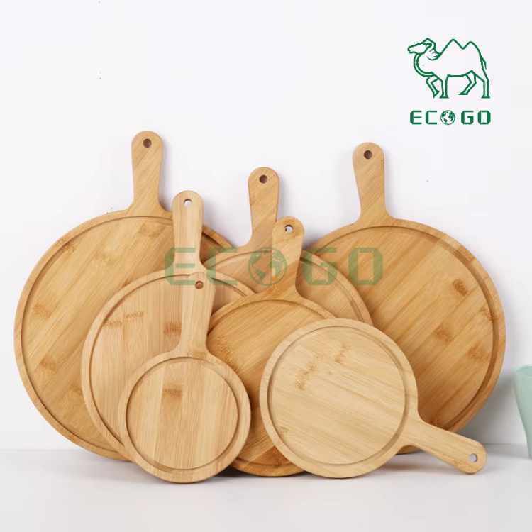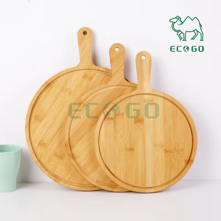 Tabla de cortar redonda de bambú para pelar Pizza, paleta con mango, pan, queso, charcutería, frutas, verduras, tabla para servir