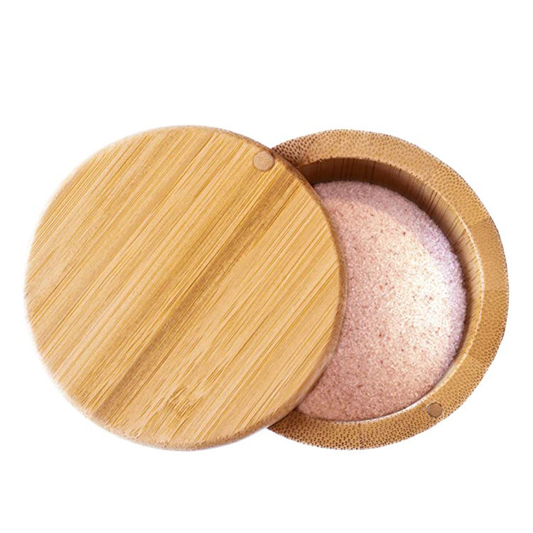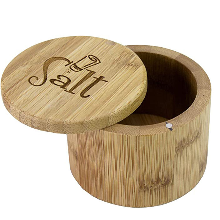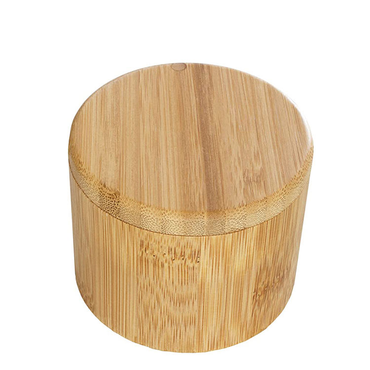 Caja de almacenamiento redonda de bambú para especias y pimienta con tapa giratoria magnética