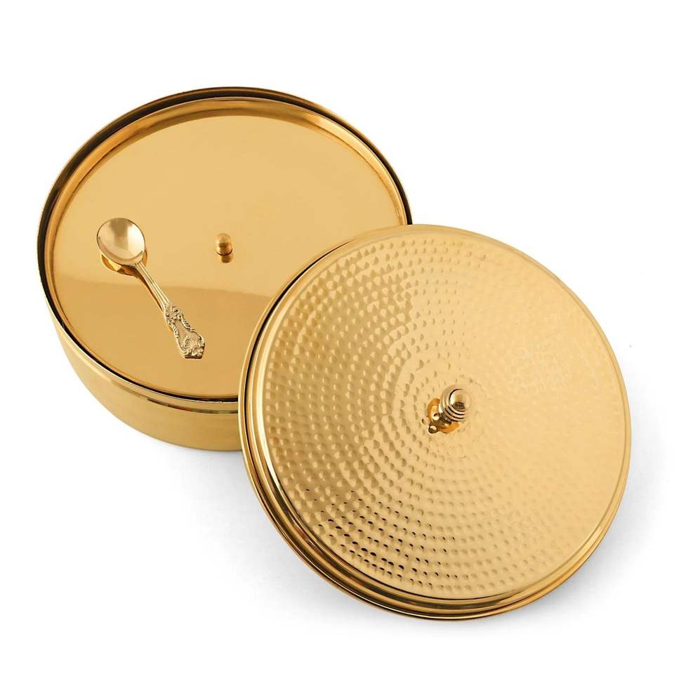 Masala Dabba Redonda de Latón con Tapa Grabada Artísticamente y Recipientes Interiores, Caja de Especias Hecha a Mano para Cocina, Hotel o Restaurante