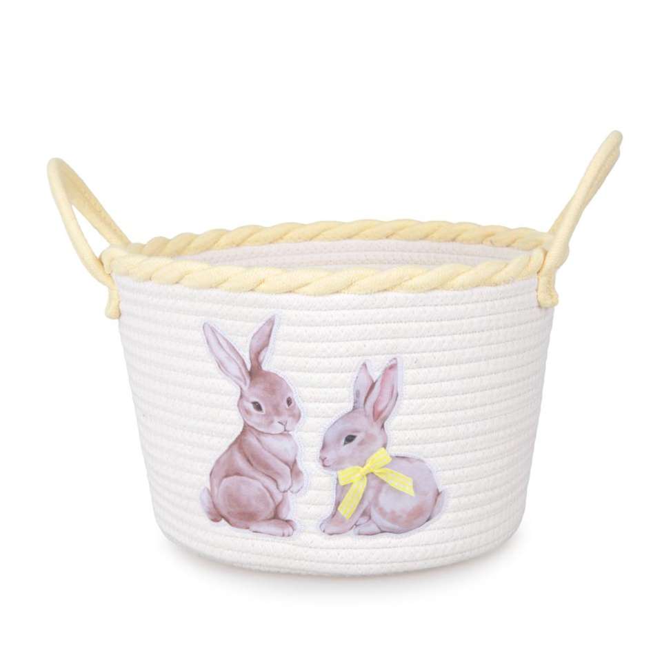 Cesta Redonda de Almacenamiento de Cuerda de Algodón con Bordado de Conejo y Asas Amarillas para Guardería, Habitación Infantil, Organizador de Juguetes, Venta al por Mayor, Personalizable