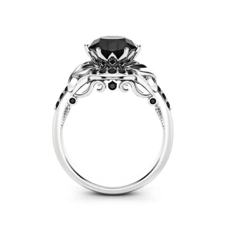 Anillo de Compromiso de Diamante Negro con Halo de Diamantes de Corte Redondo, Estilo Único para Mujer