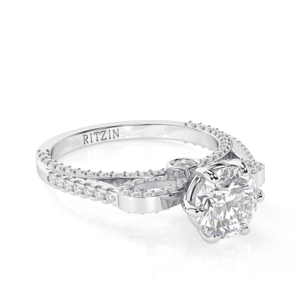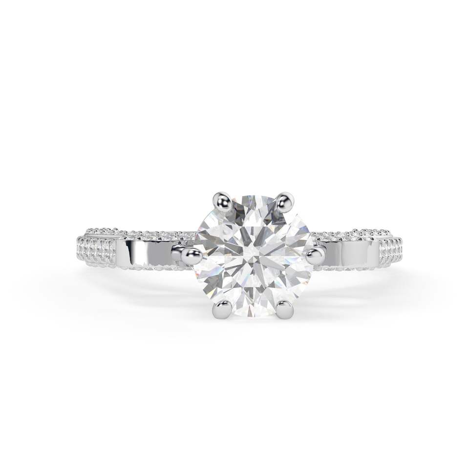 Diamante de corte redondo estilo único solitario con acentos anillo de compromiso para mujer