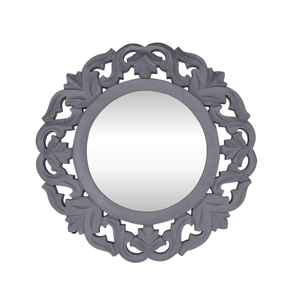 Marco de espejo de pared tallado a mano redondo para decoración de sala de estar, espejo de pared de madera de diseño Floral en madera Natural, precio al por mayor