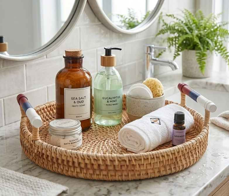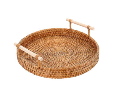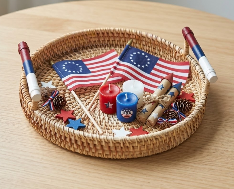 Bandeja Redonda de Ratán Tejida a Mano con Diseño Patriótico para el 4 de Julio, Barbacoa, Servir Bebidas y Aperitivos, Decoración Hecha en Vietnam