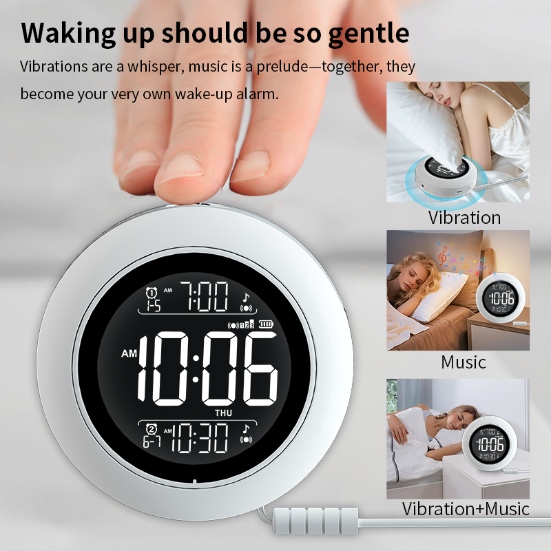 Reloj Despertador LED Redondo con Vibración, Doble Alarma, Reproductor de Música, Temporizador de Cuenta Regresiva para Dormir, Tonos de Llamada Personalizados, Reloj Despertador Semanal