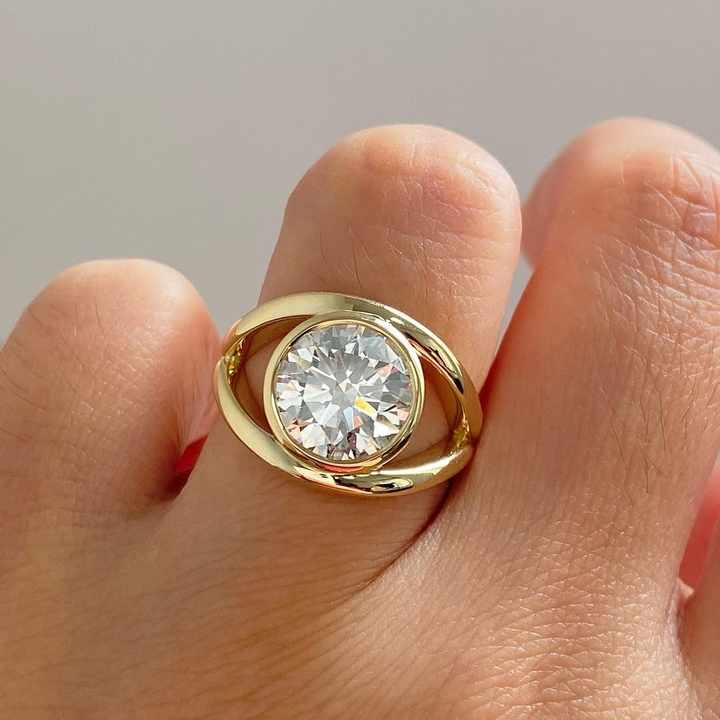 Anillo de compromiso moderno y llamativo de platino con diamante redondo cultivado en laboratorio y engaste de bisel, joyería fina