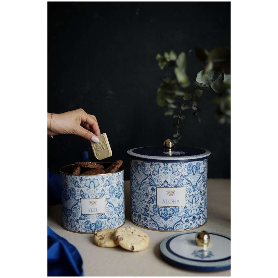 Juego de caja de lata de metal redonda Dia 175x155 - Dia 140x125 Mango de perilla (2 piezas) Patrón decorativo azul y blanco inspirado en azulejo