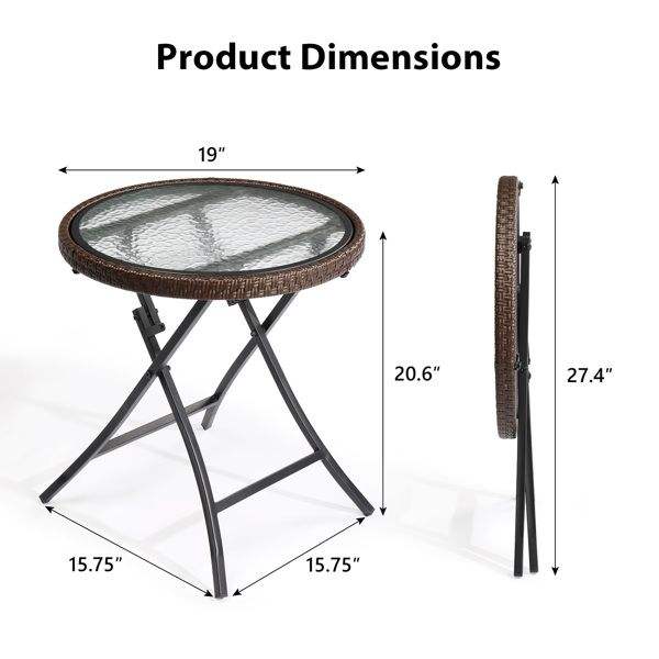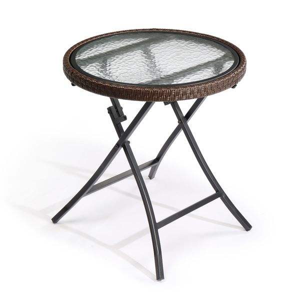 Mesa Auxiliar Redonda de Ratán para Patio con Tapa de Vidrio Templado, Mesa Plegable de Mimbre para Jardín