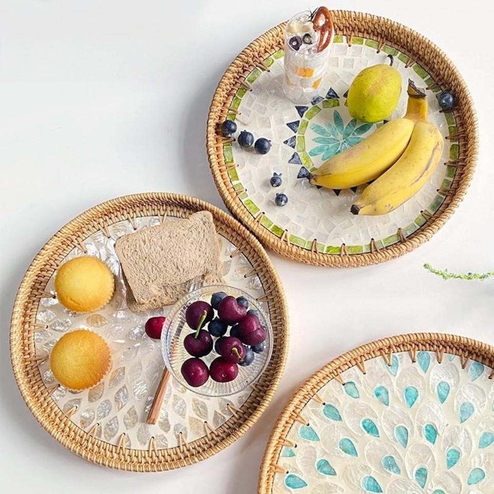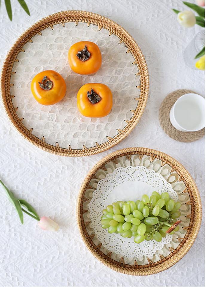 Bandeja de mimbre redonda para servir con nácar, bandeja de dulces decorativa, cesta de comida de mimbre hecha por vietnamita FBA Amazon