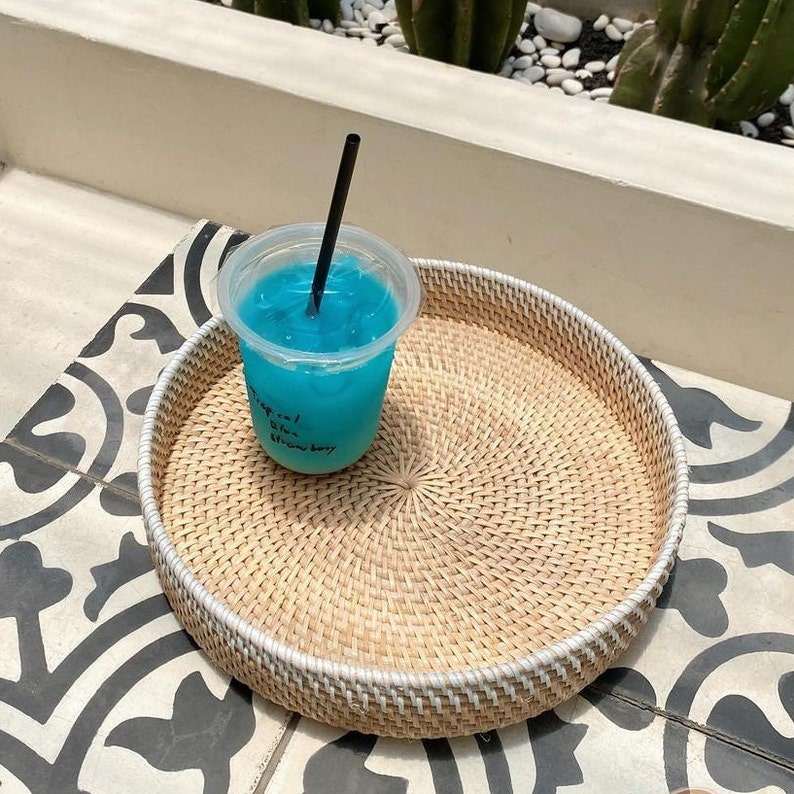 Bandeja redonda de ratán Bandeja natural Bandeja de servicio bohemia de mimbre Bandeja de mesa de café-Bandeja tejida a mano-