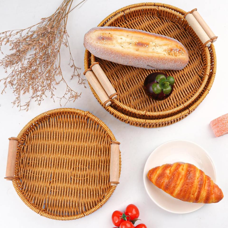 Bandeja Redonda de Ratán, Cesta Redonda Tejida con Asas, Cestas Decorativas de Mimbre, Bandejas para Servir, Duraderas y Fáciles de Limpiar