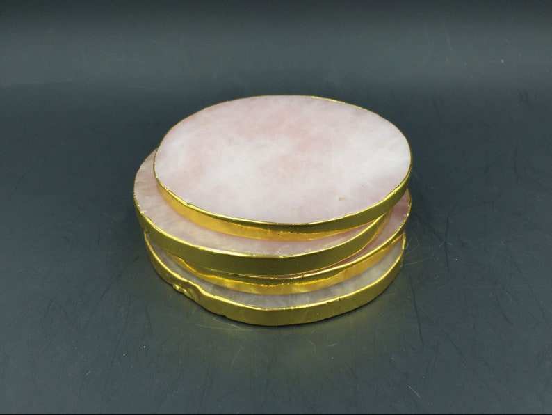 Posavasos Redondos de Cuarzo Rosa con Borde Dorado, Juego de Posavasos de Piedra de Cristal Natural para Bebidas, Decoración del Hogar