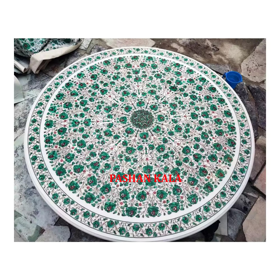 Mesa con incrustaciones de mármol blanco hecha a mano de alta calidad de forma redonda, uso de diseño moderno para mesas de comedor, venta al por mayor y proveedor