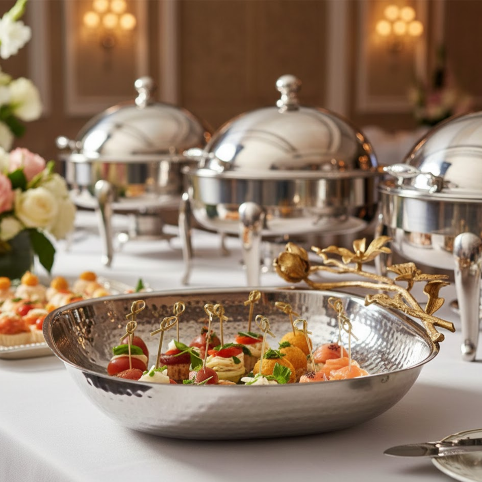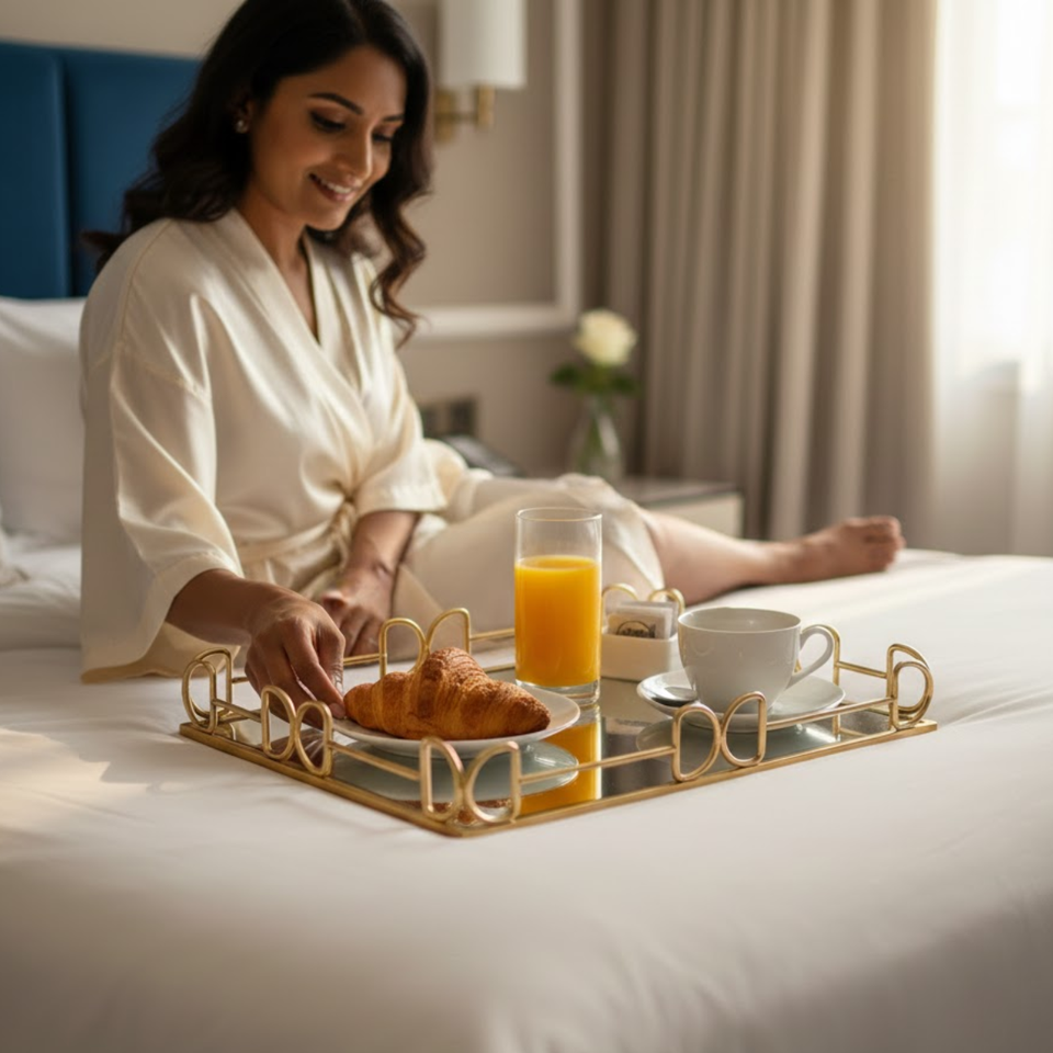 Elegante Bandeja de Servir de Metal y Vidrio con Acabado Dorado Espejo, Estilo Moderno | Soportes Multiusos Ecológicos y Seguros para Alimentos para el Hogar y Restaurantes