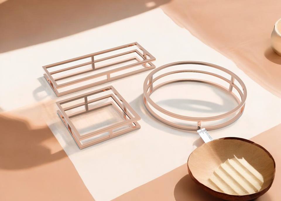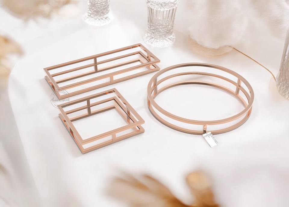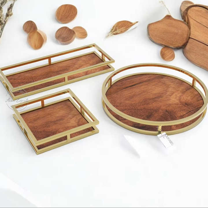 Juego de bandejas de servir de madera de mango premium con estructura metálica resistente para un estilo elegante en la cocina y una decoración moderna y versátil para el hogar.