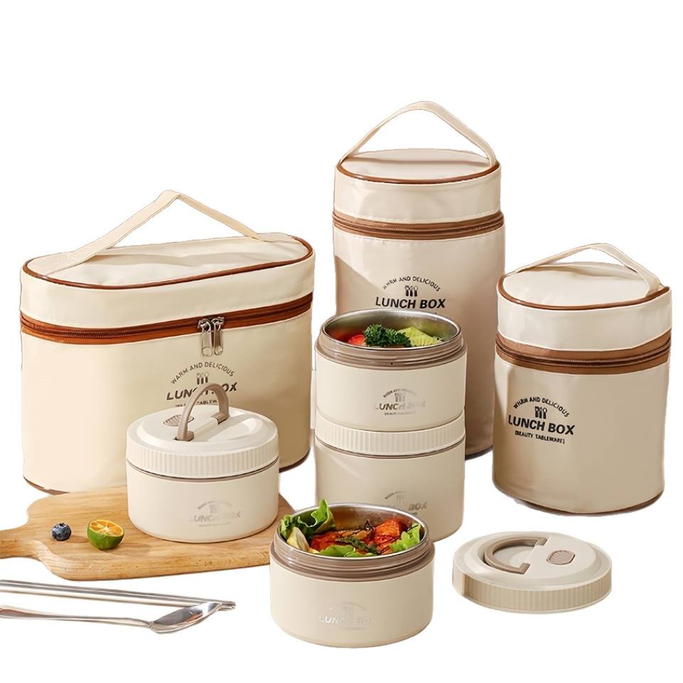2 Small & 2 Large Off-White Round Soup Jar Tableware Insulated Bag