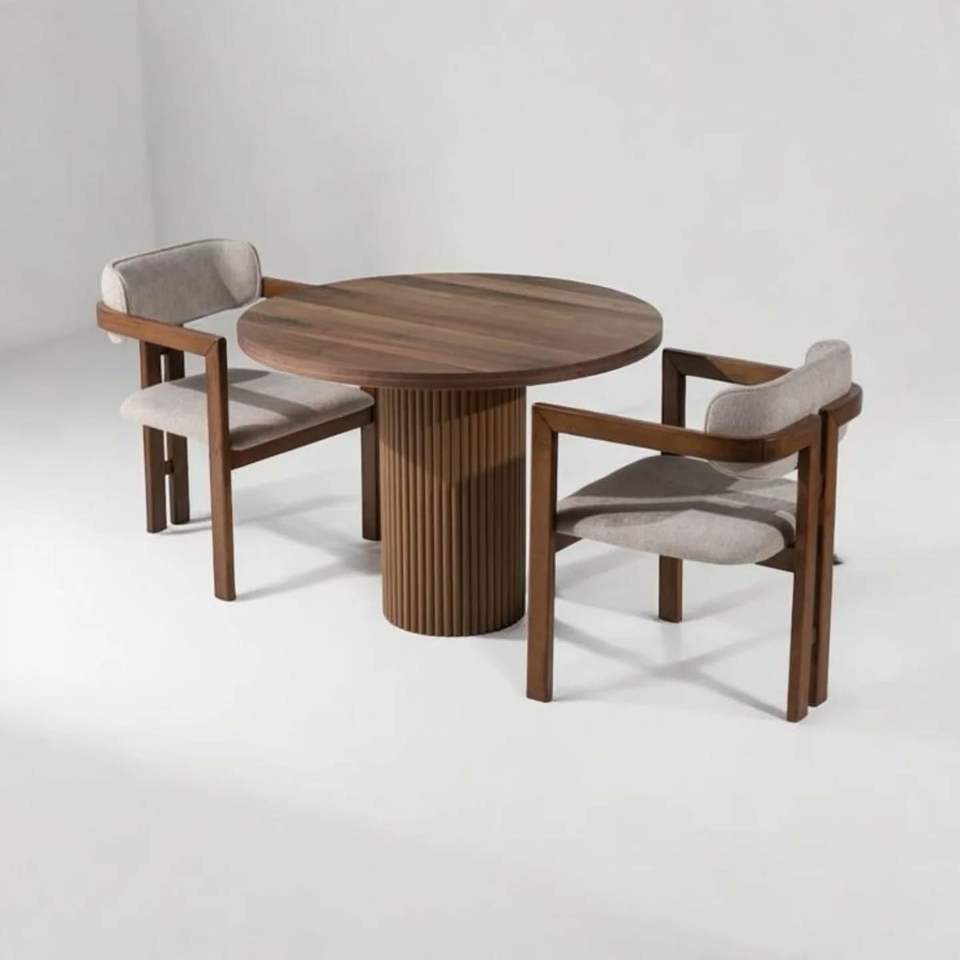 Juego de Mesa de Comedor Redonda de Madera de Teca con Sillones Acolchados con un Diseño Minimalista, Moderno, Natural y Elegante