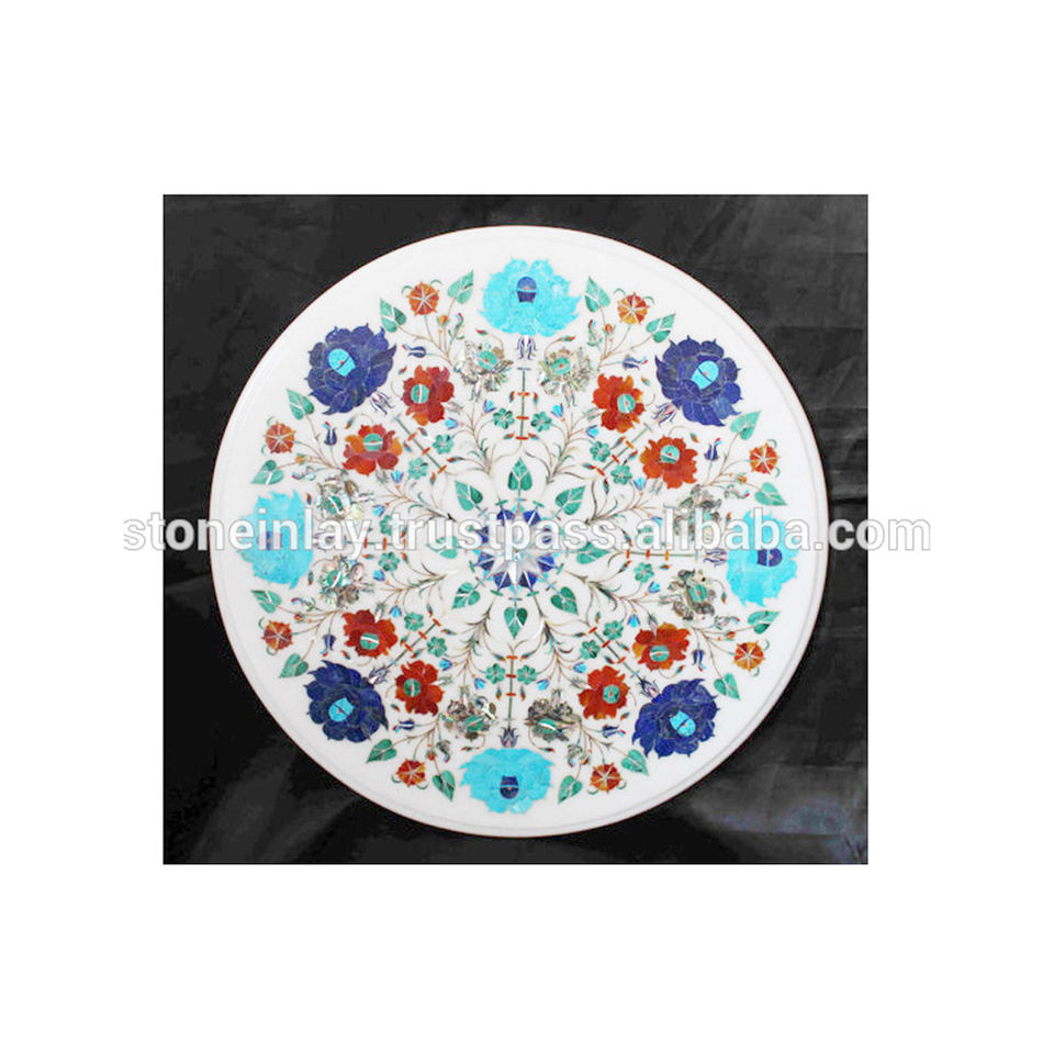 Mesa redonda con incrustaciones de mármol blanco, mesa de centro con incrustaciones de piedra antigua