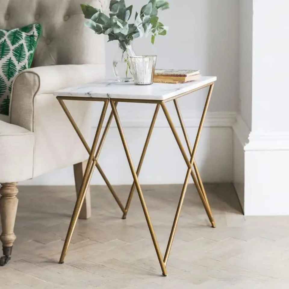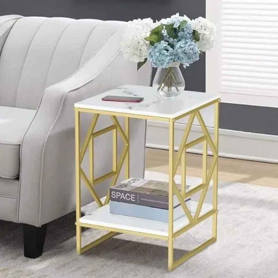 Mesa Auxiliar Redonda con Tapa de Mármol Blanco, Patas Geométricas Doradas, Estilo Minimalista Moderno, Hecha a Mano, Ecológica, para Sala de Estar o Dormitorio