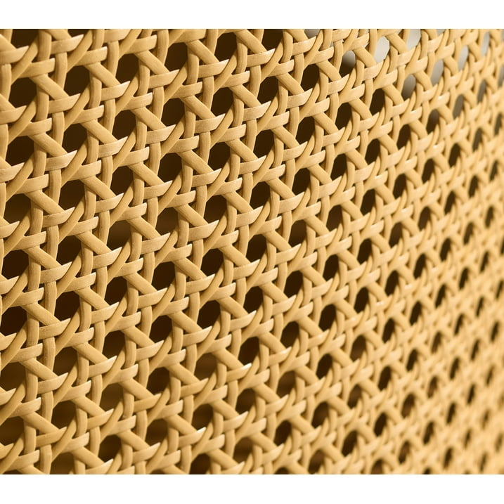 Mesa de centro redonda de madera con detalles de ratán y estante de almacenamiento