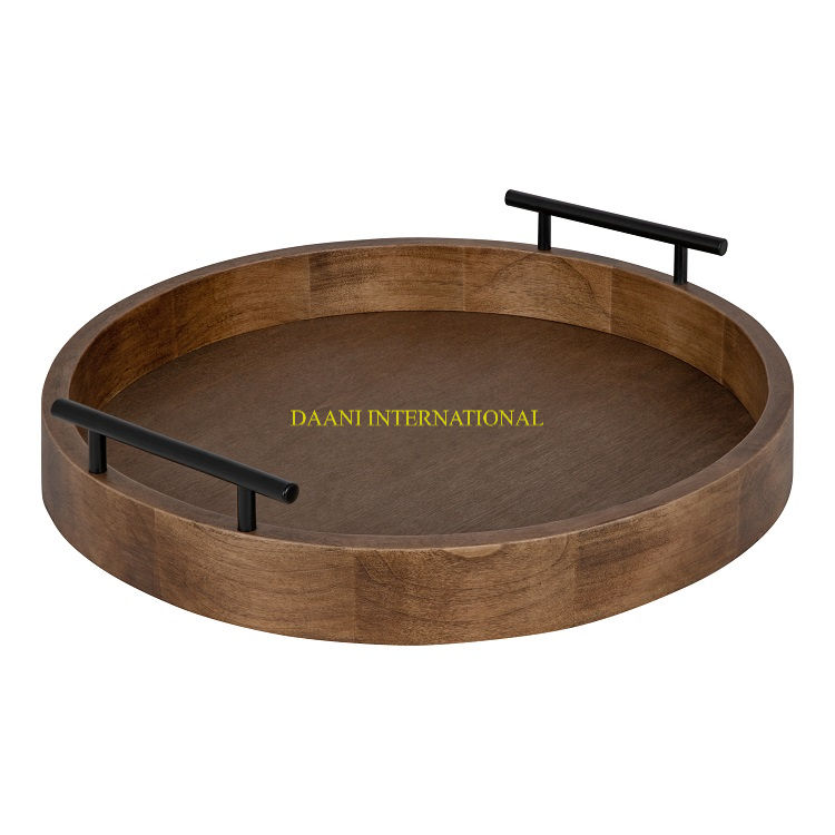 Bandeja de servicio de madera redonda con asas de metal negro Bandeja decorativa rústica moderna para bebidas de café Aperitivos y decoración del hogar