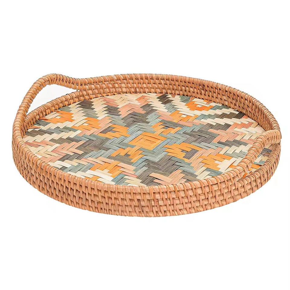 Bandeja redonda para servir, una combinación armoniosa de ratán y bambú natural. Cuenta con una asa.