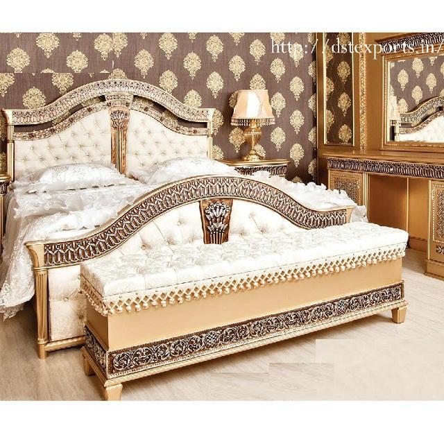 Cama Moderna de Madera de Teca Maciza de Estilo Europeo Tallada en Dorado Real con Diseño Duradero, Tamaño y Color Personalizables