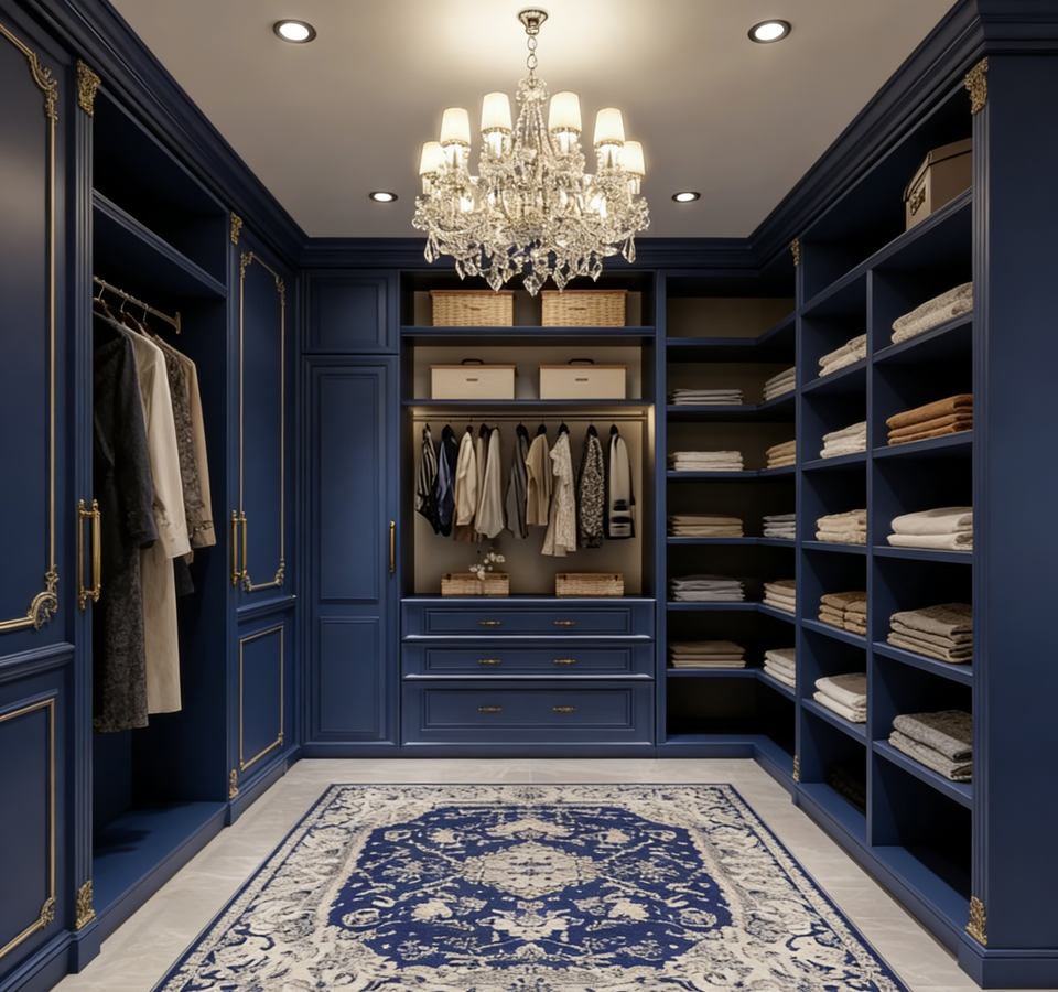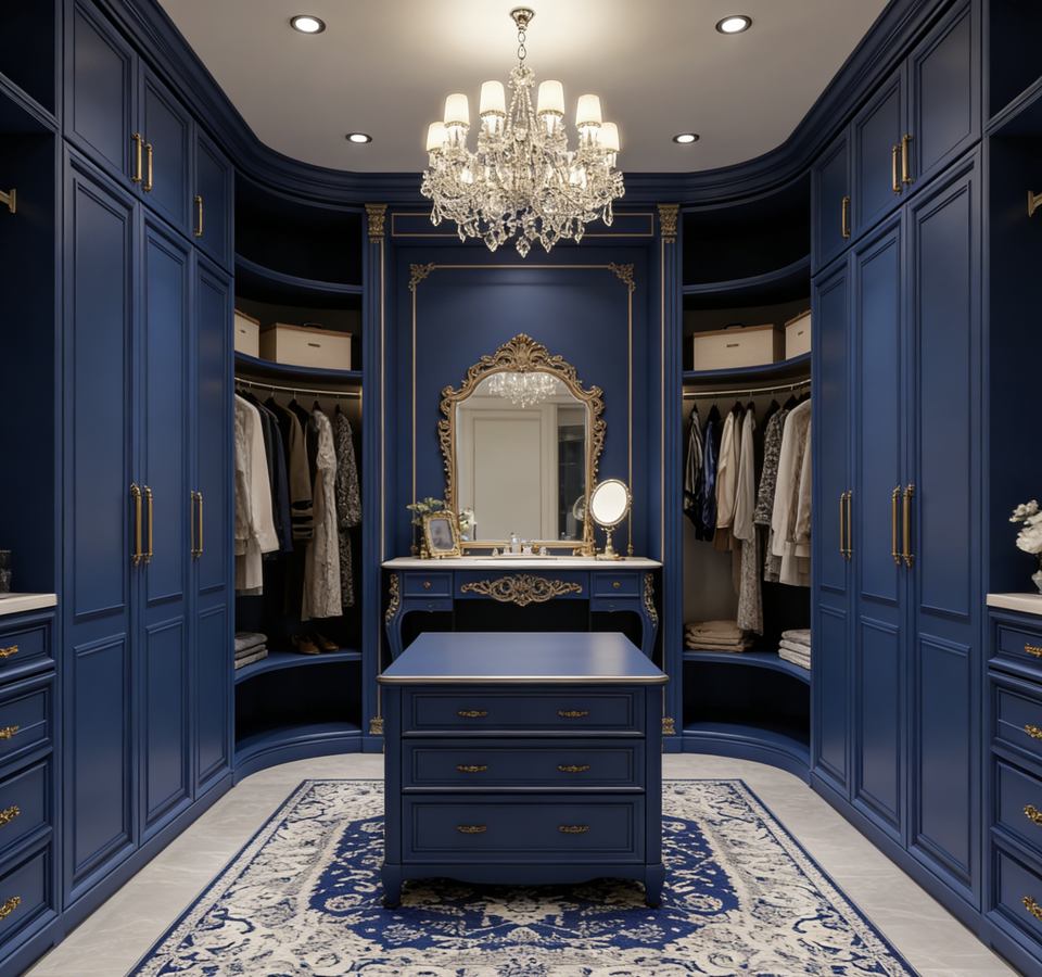 Vestidor Estilo Royal Navy Francés - Herrajes Dorados Ornamentados e Iluminación LED, Almacenamiento de Lujo para Espacios de Vestir Opulentos