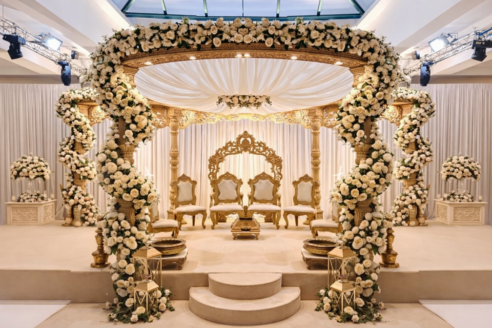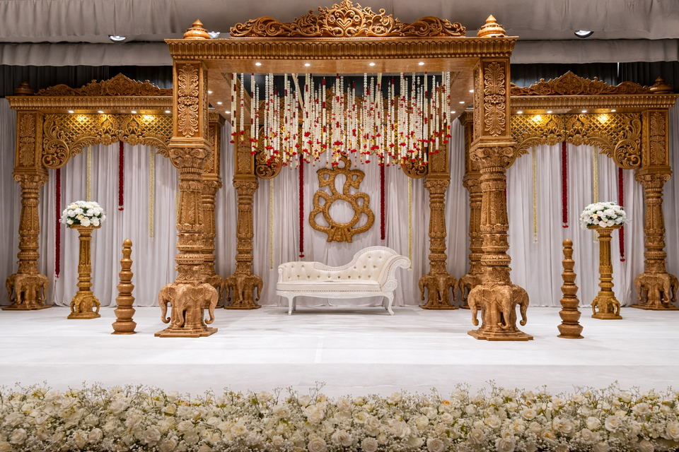 Mandap de Boda Abierto con Temática Real Rajasthani, Pilares Indios Ajanta Ellora, Decoración de Boda del Sur de Asia, Abhishek USA