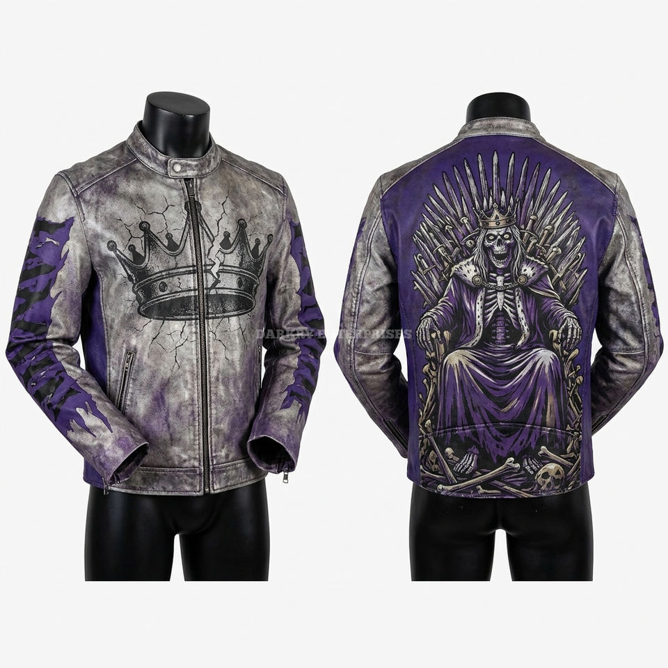 Chaqueta de Cuero Royal Skeleton King Racing con Gráfico de Corona Púrpura, Estilo Biker, Gótico, Streetwear, Moto, Ropa de Lujo para Hombre