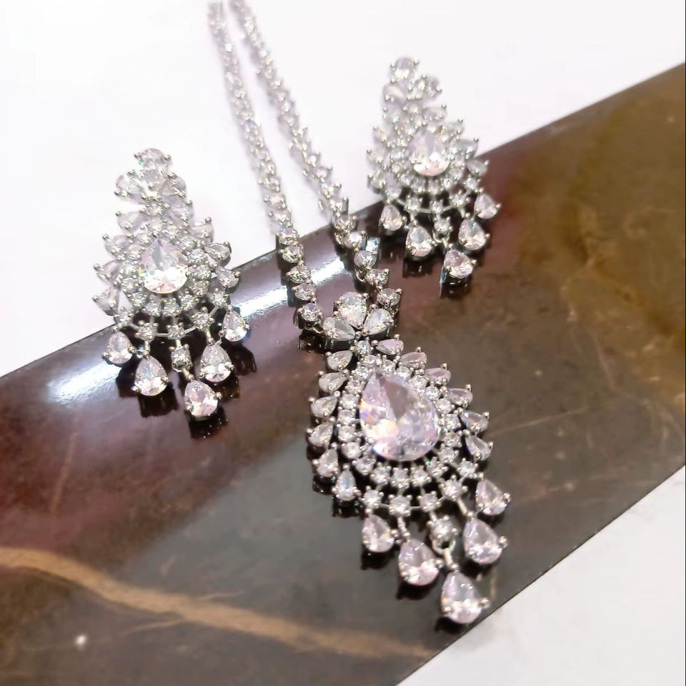 Conjunto de Collar y Pendientes Plateados con Pedrería Blanca Estilo Real – Joyería Nupcial Glamorosa para Novias