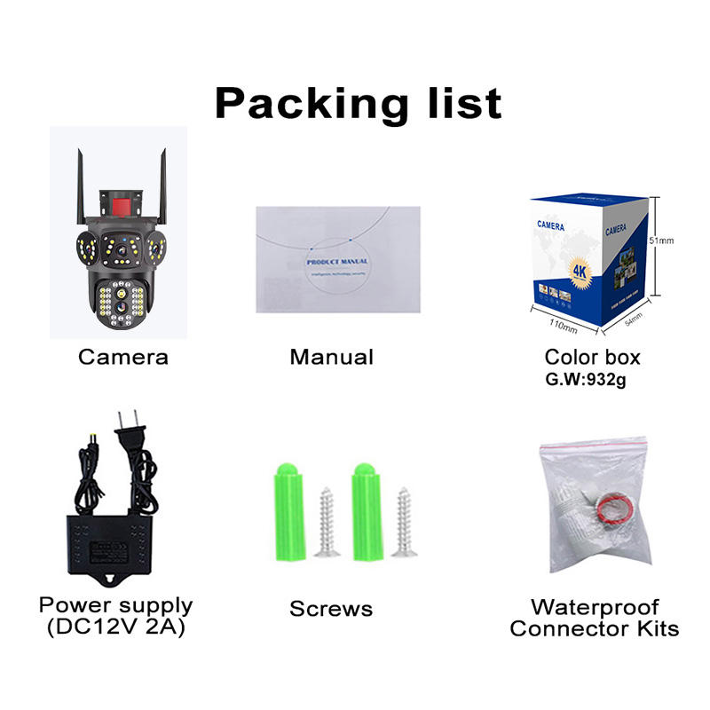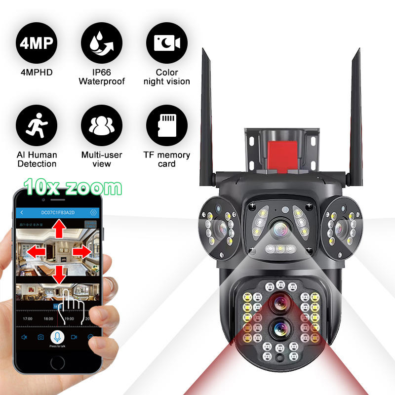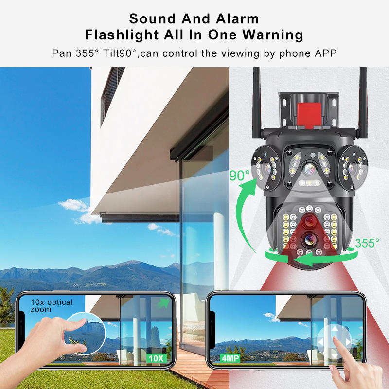 Rscamtom V380 Pro cámara de seguridad WiFi 12MP con tres lentes para granja, alarma roja, visión nocturna a color y seguimiento automático