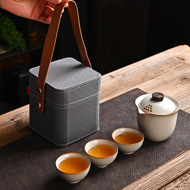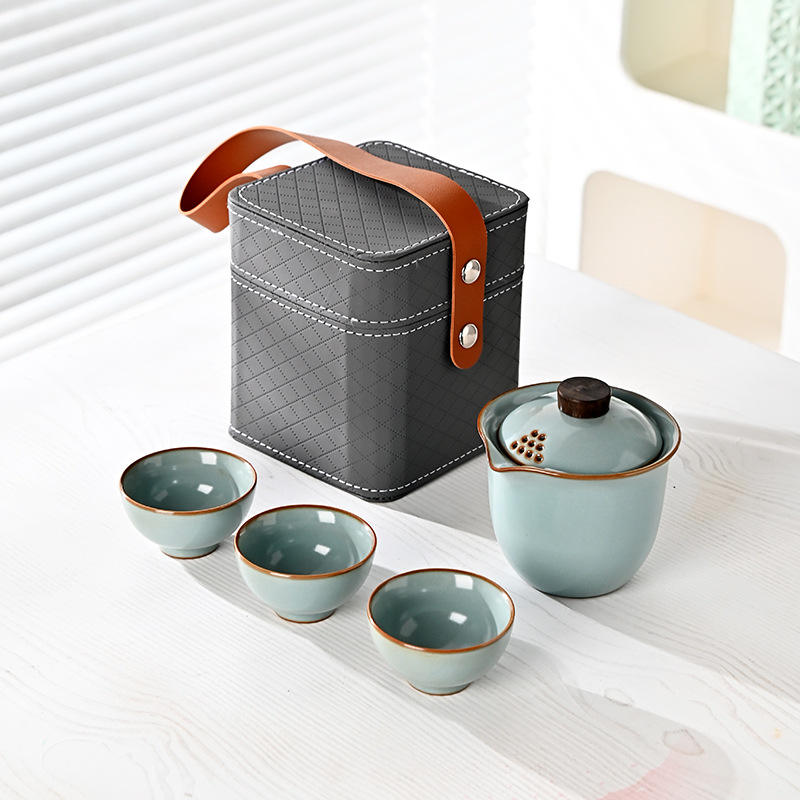Juego de Té Portátil de Cerámica Ru Ware, Tetera Kung Fu con 3 Tazas, Juego de Regalo Ligero para Uso en Exteriores
