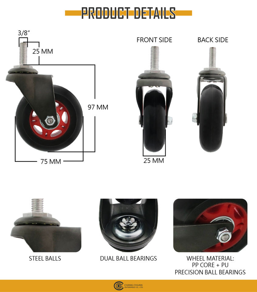Nombre del producto:CCE Caster 3 pulgadas PU Silent Bearings Muebles Ruedas Caster