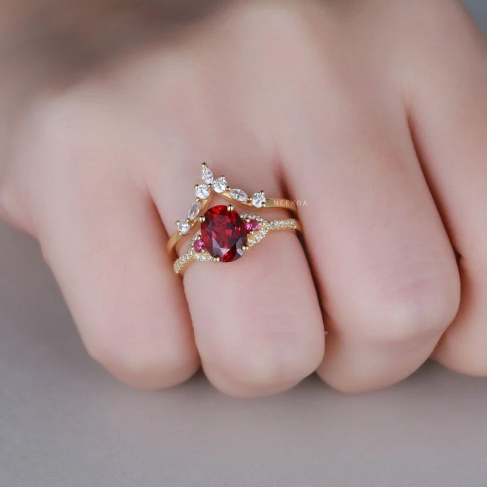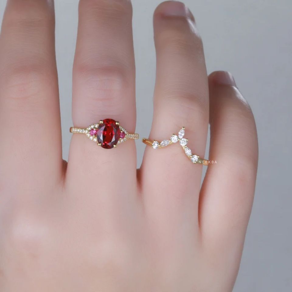 Conjunto de anillos de novia de rubí-Anillo de compromiso de rubí de corte ovalado emparejado con banda de boda de contorno, joyería de rubí fino de plata 925 DE LA India