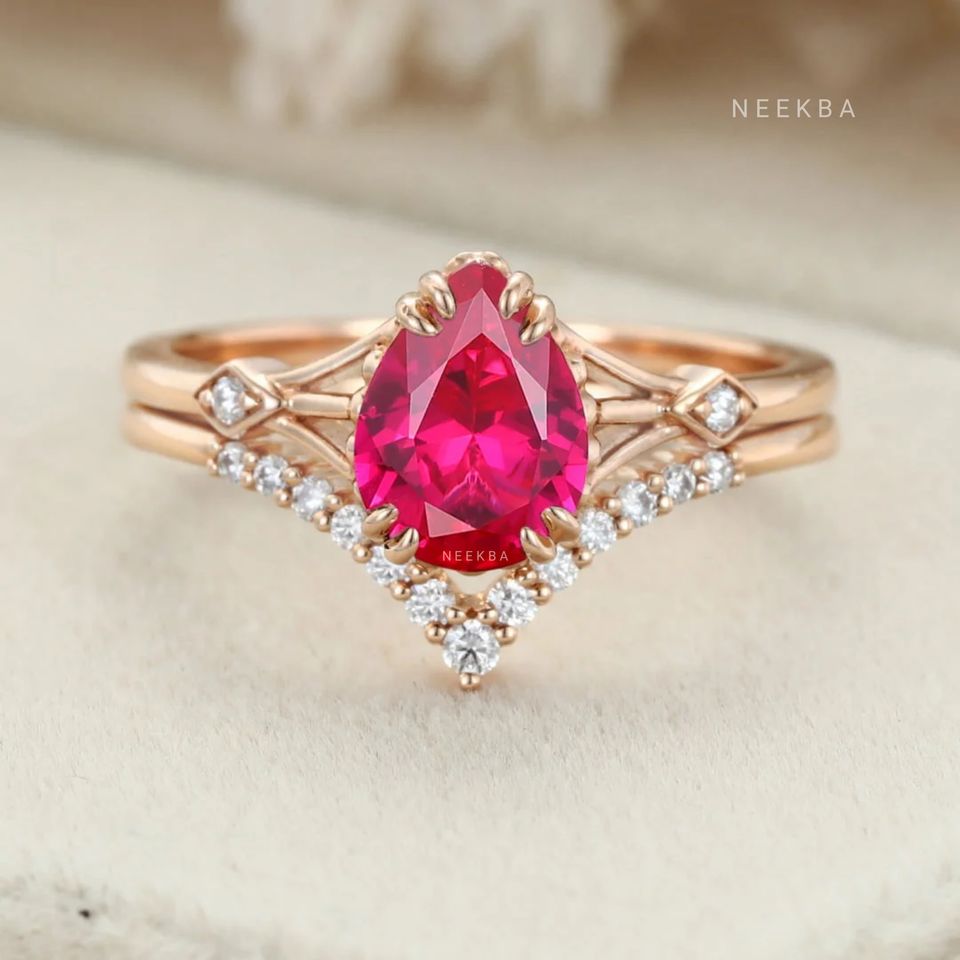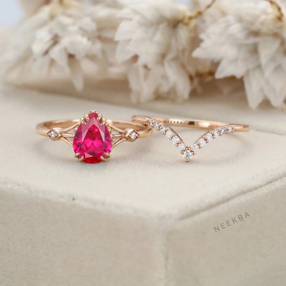 Conjunto de boda de rubí y diamantes-Anillo de punta de garra de rubí en forma de pera y banda de boda de moissanita, anillos de solitario de oro rosa sólido de 14 quilates