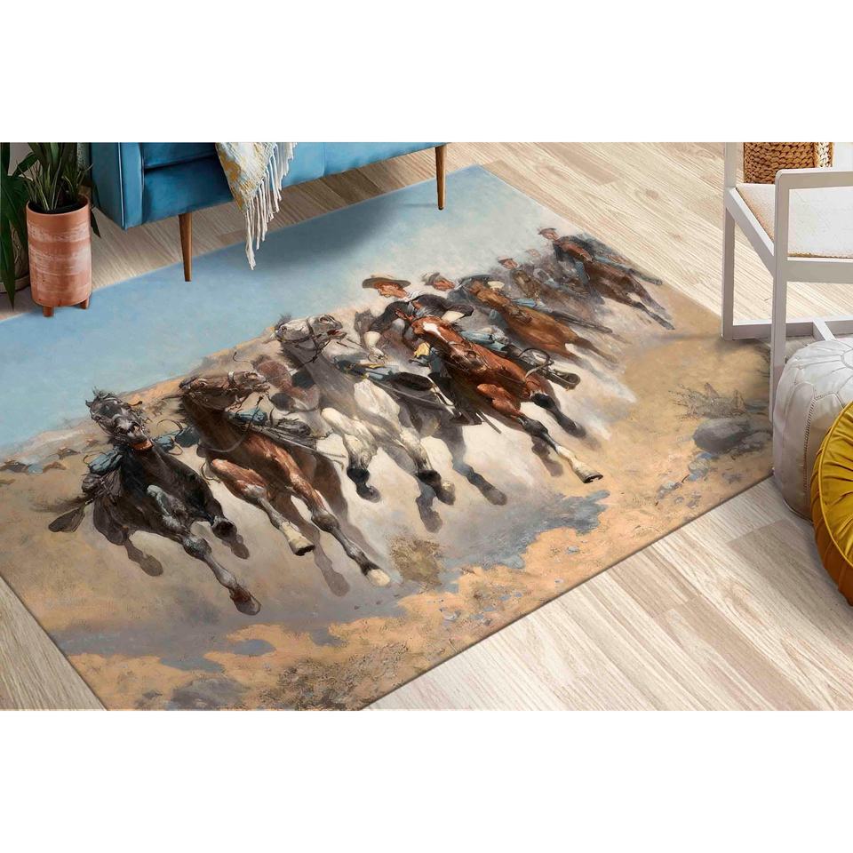 Alfombra con Diseño de Caballos Corriendo: Decoración Estilo Saloon Occidental, Alfombra Impresa, Alfombra Delgada No Tejida