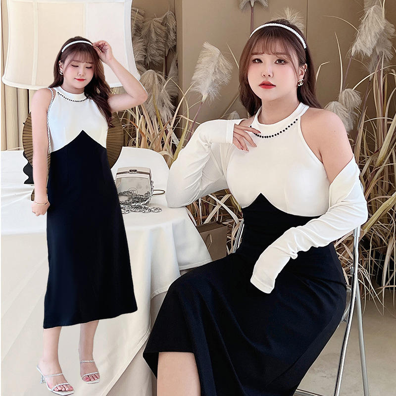 color:Vestido color block blanco y negro con cárdigan blanco