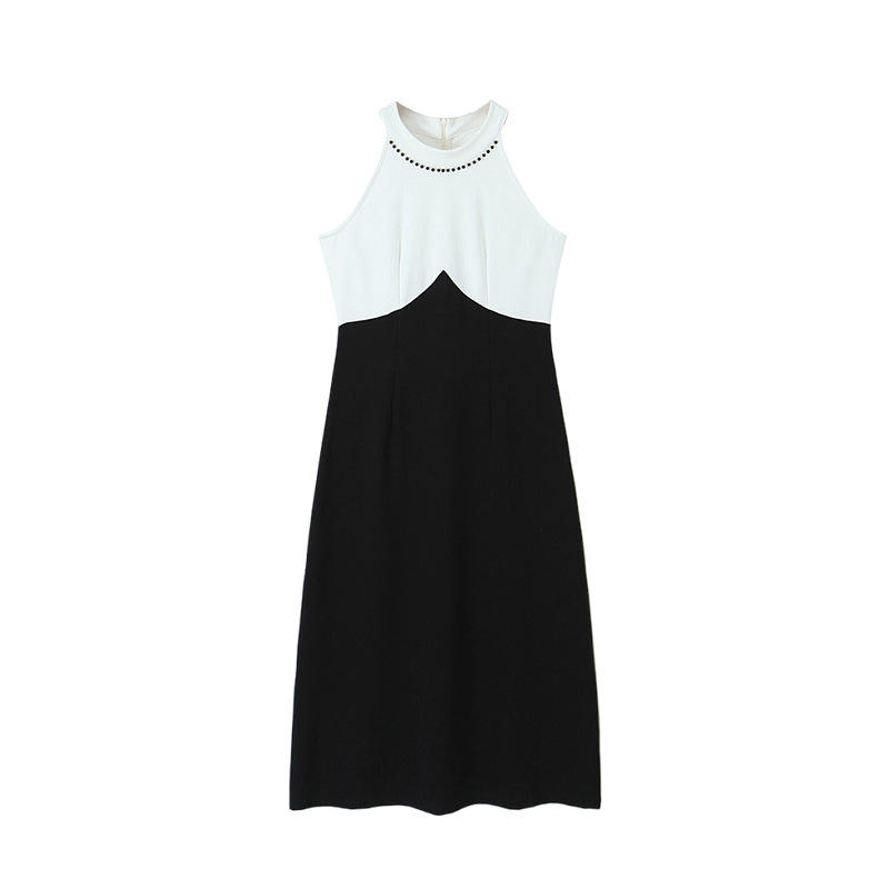 Vestido midi Runqi N8696 con cuello halter, bloques de color, cintura imperio, línea A, contraste blanco y negro, vestido de noche para mujer