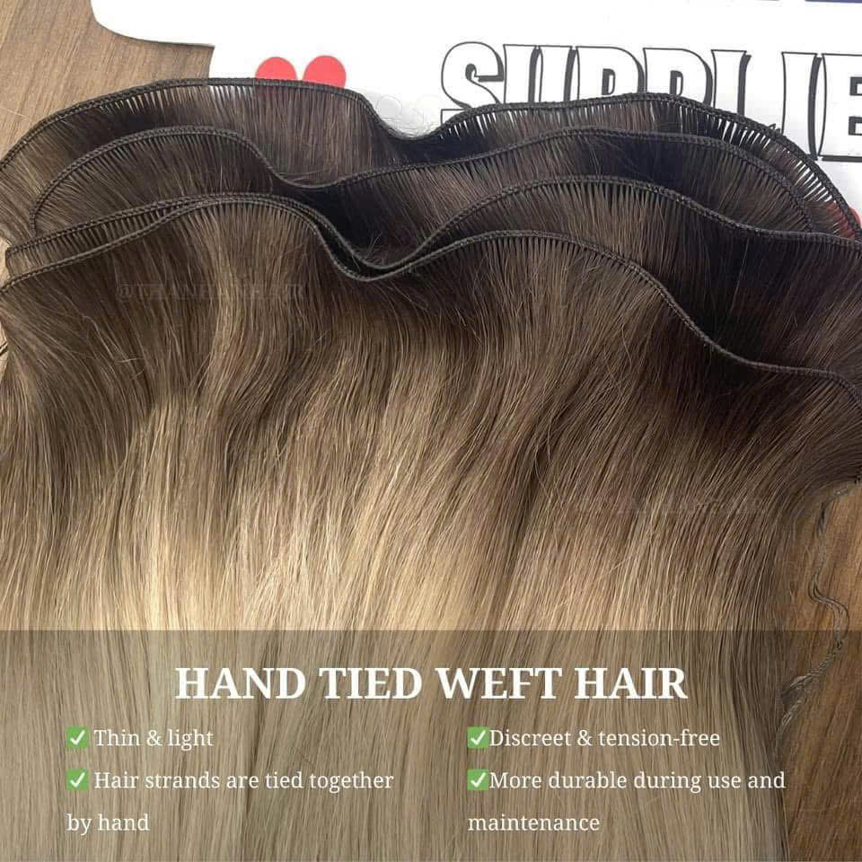 Extensiones de cabello de trama atadas a mano invisibles finas rusas Extensiones de cabello humano dibujado doble Trama atada a mano vietnamita