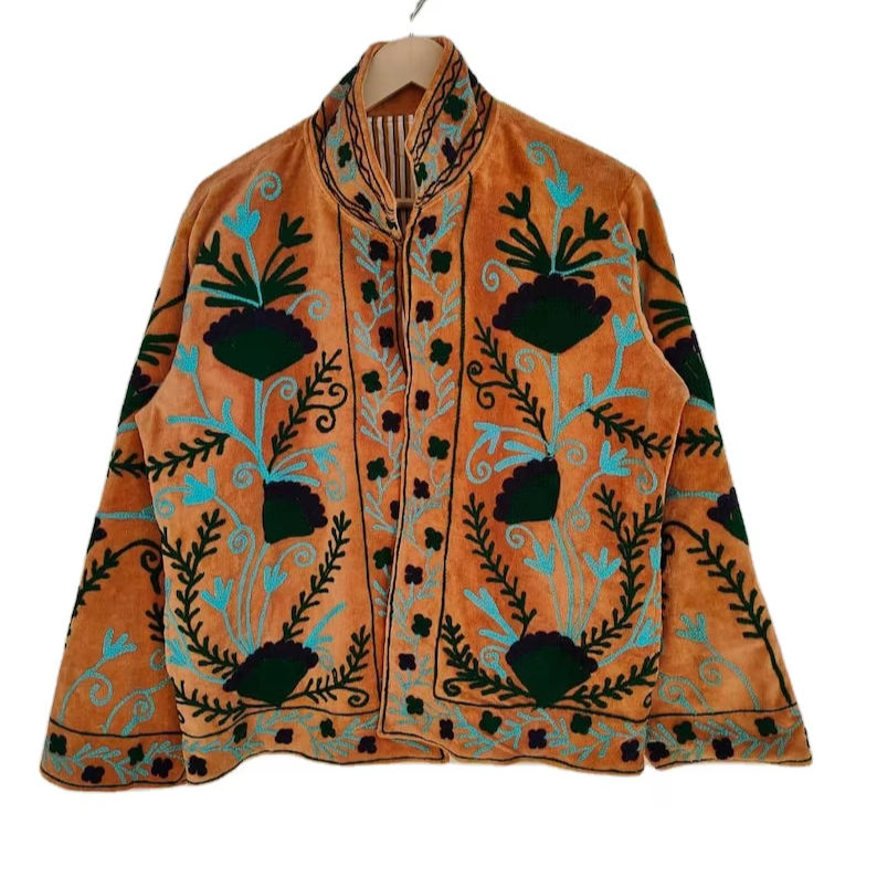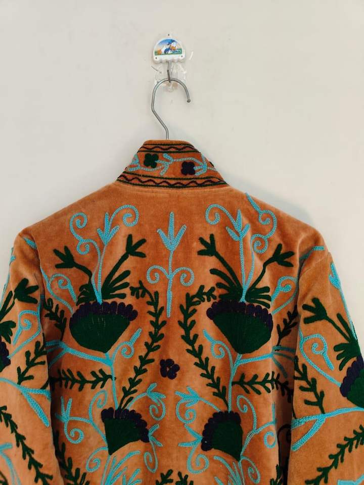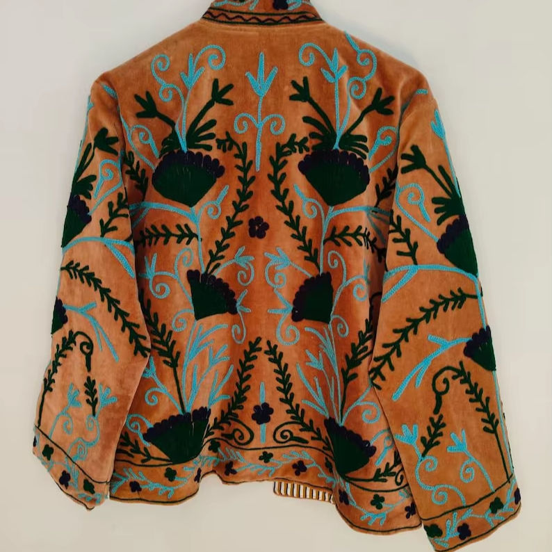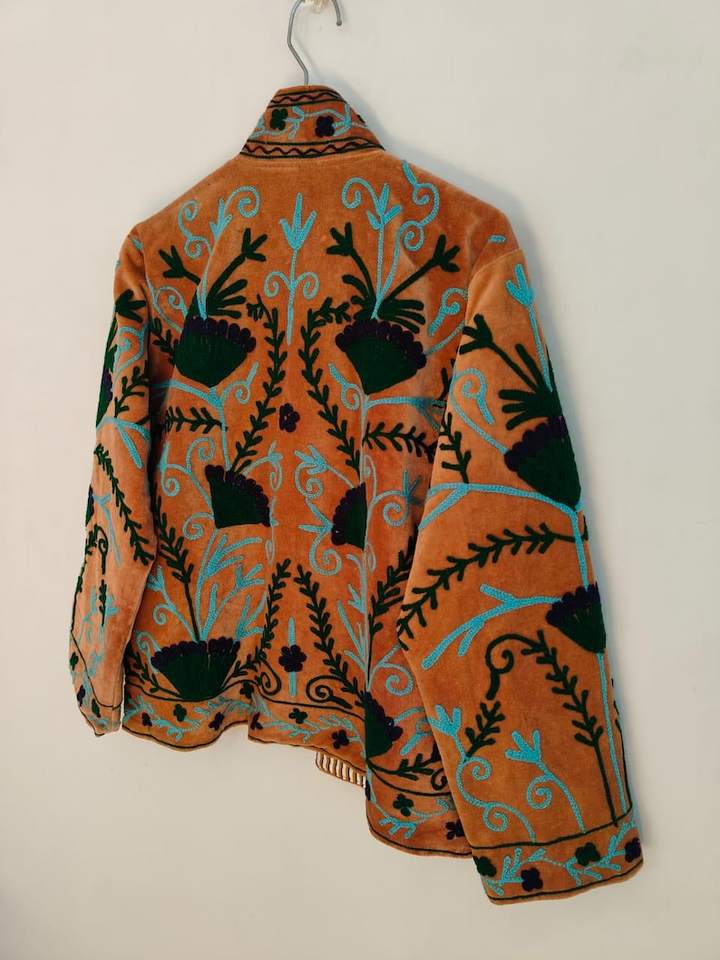 Chaqueta de terciopelo rojo con bordado Suzani, abrigo artesanal de arte folclórico floral, chaqueta de invierno bohemia étnica para mujer, arte vintage.